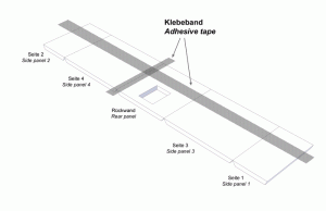Während der Trocknungsphase breitet man vor sich folgende einzelne Bretter als aufgeklapptes Gehäuse aus. Die Reihenfolge von links nach rechts lautet: Seite (2), Seite (4), Rückwand, Seite (3), Seite (1). Die Gehrungsöffnungen, also die ins Gehäuse zeigenden Flächen, sollten dabei nach unten zeigen. Es ist äußerst wichtig, die korrekte Reihenfolge und die richtigen Gehrungen zueinander beizubehalten und auf einem glatten und sauberen Untergrund zu arbeiten. Nun zieht man mehrere Bahnen mit Klebeband (z.B. Paketklebeband) über die aufgeklappten Bretter, sozusagen als Schutz gegen Verrutschen und als eine Art „Scharnier“ für den späteren Zusammenbau (siehe auch „Zyklop Bauhilfe 1“). Danach dreht man die „Kette“ aus Brettern gemeinsam auf die eigentliche Außenseite (eine zweite Person ist hier hilfreich) und setzt anschließend das bereits verleimte Konstrukt aus den beiden sechseckigen Brettern, Boden und Deckel auf die Rückwand und verleimt dieses dort. Nach einer kurzen Trocknungszeit, nachdem ausreichend Stabilität erreicht wurde, verleimt man die Gehrungen der Seitenwände, sowie sämtliche dazugehörigen Kanten (siehe auch „Zyklop Bauhilfe 2“ inkl. der markierten Kanten, die mit Leim eingestrichen werden müssen) und klappt die Wände nach oben. Mittels Klebeband werden diese Platten untereinander fixiert, so dass das Tieftönergehäuse problemlos trocknen kann (siehe auch „Zyklop Bauhilfe 3“).