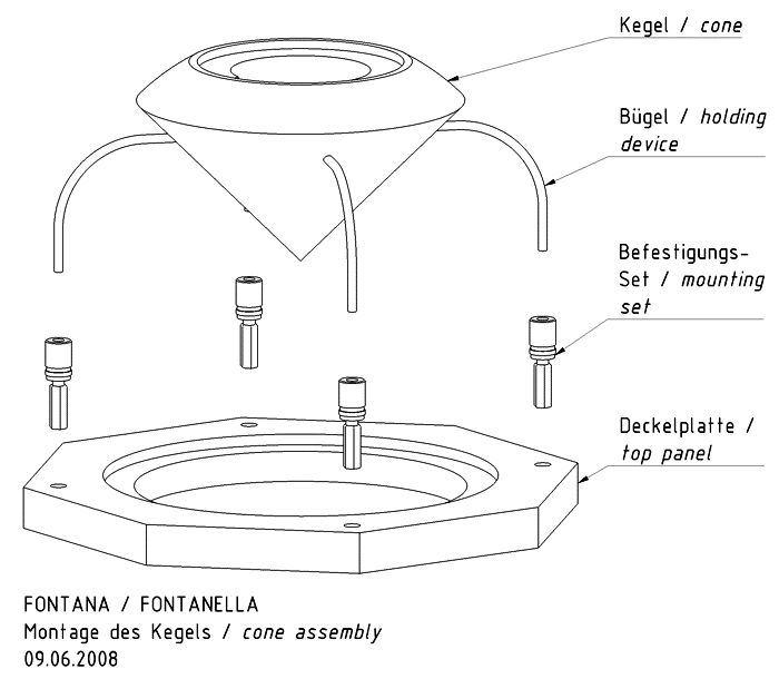 The upper section of the speaker consists of one large cone over the low- to midrange speaker and a smaller one over the tweeter. The large coneis connected to the bass cabinet via the mounting sets and brass rods. Two of these brass rods also serve as signal carriers to the tweeter which is mounted in the large cone. Two short wires (approx. 5 cm long) are soldered to the tweeter and two of the rods. Take care to ensure that you solder the wires to the right rods - these must be the ones which are connected via the mounting sets to the crossover in the cabinet. The entire upper section can now be mounted on top of the cabinet.