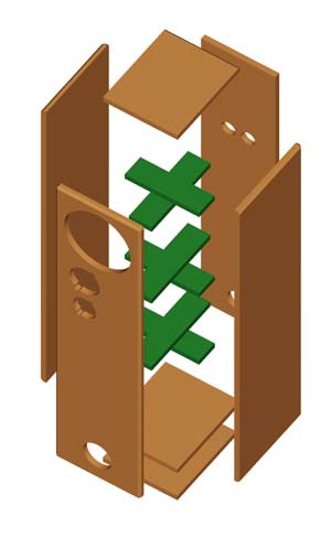 As shown in the drawing, the three upper chambers are loosely filled with damping material. The lowest chamber remains empty. It is easiest to roll or fold the mats before pushing them through the four openings between the stiffeners and thus prevent them from slipping later.