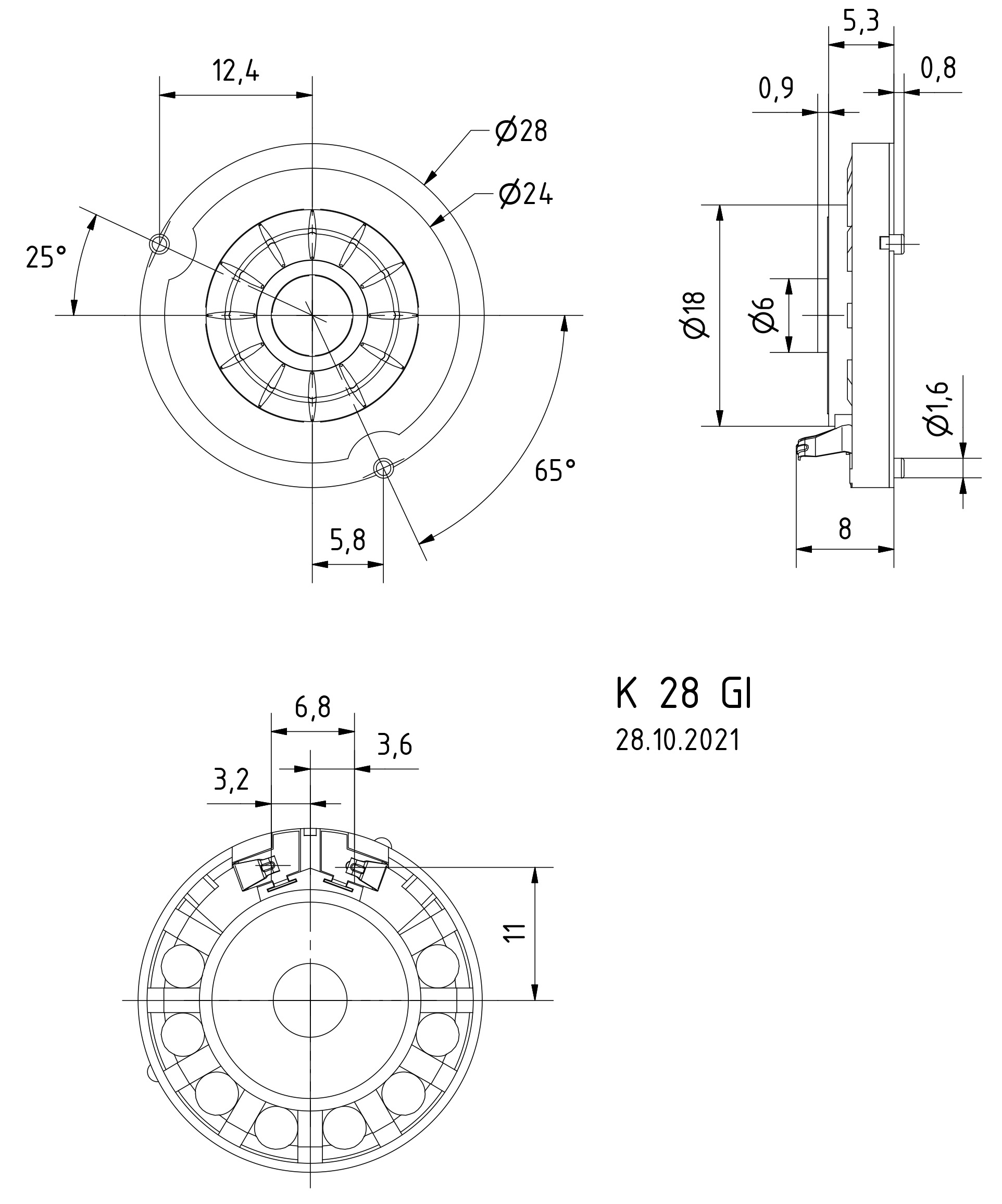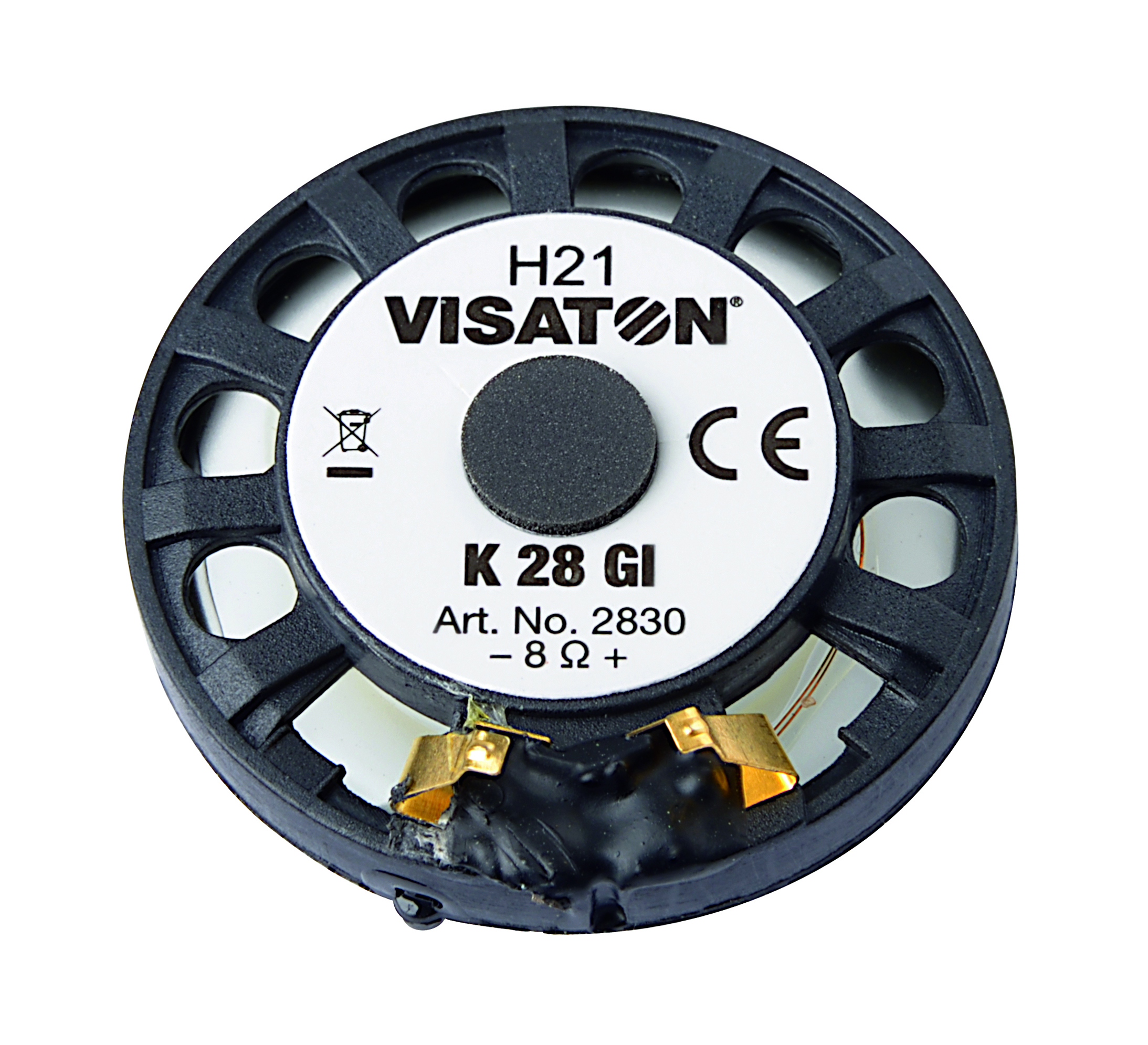2,8 cm (1,1") Kleinlautsprecher mit Kunststoffmembran und rundem Kunststoffkorb. Geringe Baugröße, deshalb geeignet zur Signalausgabe in Geräten, in denen wenig Platz zur Verfügung steht. Der Anschluss erfolgt über rückseitig angebrachte Federkontakte.