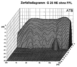 Zuerst wurden die Messungen mit Ferrofluid durchgeführt, dann mit saugfähigem Papier die Füllung ausgesaugt und anschließend die Messungen wiederholt. Abb. 1 zeigt die Amplituden- und Impedanzkurven mit und ohne FFL. Ohne FFL ist die Resonanzüberhöhung bei 1 kHz stark ausgeprägt, mit FFL dagegen auf 1500 Hz gestiegen und deutlich gedämpft. Entsprechend sinkt der Amplitudenpegel bei der bedämpften Version im Bereich der Resonanzfrequenz. Die Impedanzüberhöhung ist nicht völlig unterdrückt. Daran erkennt man, daß Ferrofluid mit geringer Viskosität (dünnflüssig) verwendet wurde. Dadurch ist die Gefahr des Verharzens auch nach langer Zeit gebannt. Oberhalb 2000 Hz gibt es keine nenneswerten Unterschiede in den Kurven und damit weisen beide Versionen die gleiche Klangfarbe auf. Der etwas linearere Frequenzverlauf mit Ferrofluid ist kein prinzipieller Vorteil der Füllung sondern hat vermutlich mit dem abgedichteten Luftspalt zu tun. Auch ohne FFL kann man selbstverständlich einen völlig gleichmäßigen Frequenzgang realisieren. Wie sieht nun das zeitliche Verhalten der beiden Kalottenversionen aus? In Abb. 2 können die Ergebnisse der Wasserfall-Messungen verglichen werden. Bis auf den Pegelunterschied unterhalb 2000 Hz ist im Ausschwingverhalten keine wesentliche Differenz zu erkennen. Das etwas schlechtere Verhalten der Kalotte ohne FFL bei 7000 Hz sollte nicht überbewertet werden, da es sich bei -25 dB abspielt. Auf jeden Fall kann festgestellt werden, daß das Ferrofluid nicht zu einer Verzögerung im Ausschwingen führt. Auf der Suche nach einem eventuellen Problem, das durch Ferrofluid verursacht werden könnte, wurde noch das dynamische Verhalten untersucht. Ein Tonburst mit 5000 Hz und 10 000 Hz wurde auf beide Kalottenversionen zunächst mit einer Leistung von 0,2 Watt und dann mit 20 Watt angesteuert. Zur besseren Vergleichbarkeit wurden die Pegelunterschiede am Mikrofonverstärker ausgelichen. Das ideale Ergebnis wäre also zwei völlig deckungsgleiche Kurven, was in Abb. 3 für beide Kalottenversionen auch der Fall ist. (Bei 5000 Hz ergibt sich die gleiche Übereinstimmung wie bei 10.000 Hz.) Ein Sinussignal von 20 Watt ist für eine Kalotte mit 25 mm-Spule ohne Ferrofluid schon eine beträchtliche Belastung, bei der immerhin ein Pegel von 103 dB ensteht. Dieser Versuch hat also gezeigt, daß selbst bei so hohen Impulsspitzen das Ferrofluid die Pegelspitzen nicht kappt. Bleibt noch zu untersuchen, was geschieht, wenn durch eine hohe Dauerbelastung das Ferrofluid bereits warm geworden ist.